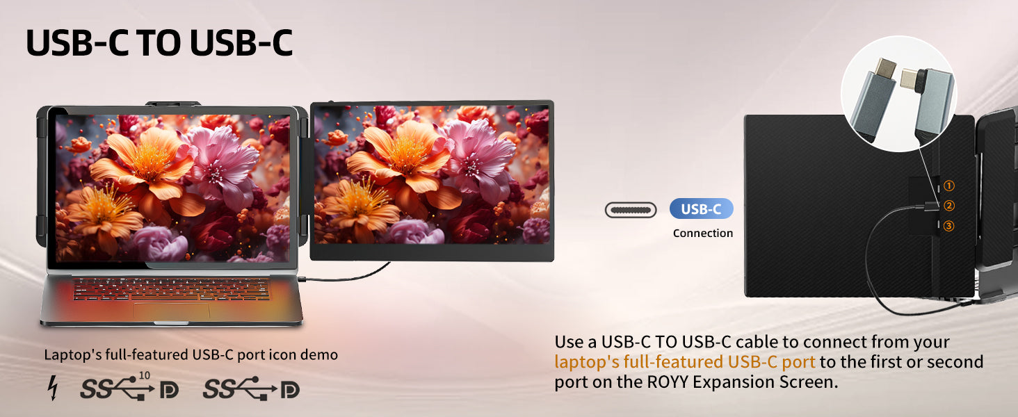 1 full featured USB-C port or 1 HDMI port, that's all your laptop need. This laptop monitor extender includes all necessary cables (1* USB-C to USB-C Cable, 1* USB-A to USB-C Cable, 1* HDMI to USB-C Cable). Simply connect the portable monitor to your laptop via USB-C or HDMI and USB-A cable without the hassle of downloading additional drivers. Note: When using the HDMI cable, ensure to connect a USB-A to USB-C cable to the same screen extender for power supply.