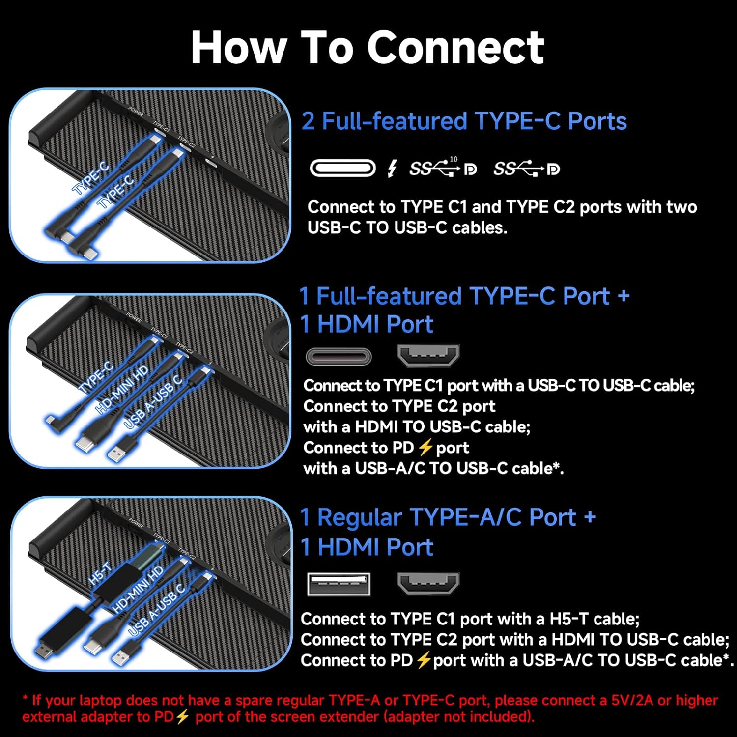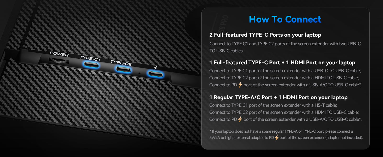 Whether you choose a USB-C or USB-A add HDMI cable, simply plug in laptop to start using it, with no need for any drivers. The USB-A to USB-C cable is just support power supply! Please note: Mac with M1/M2/M3 chips or your laptop does not have an HDMI port, our included H5-T converter can convert the laptop's USB-A/USB-C port to an HDMI port for output, thus eliminating compatibility issues. Installing drivers is required when using H5-T.